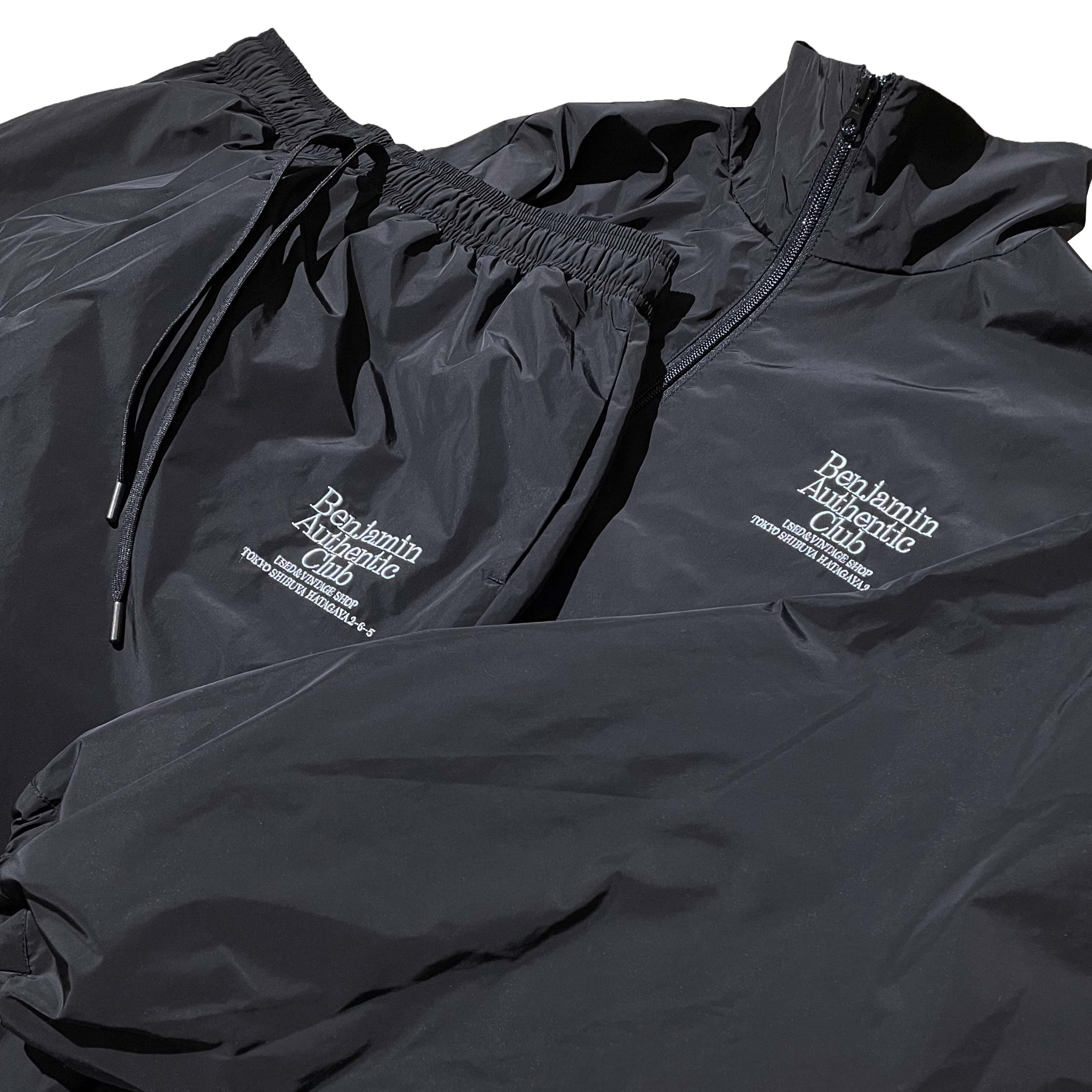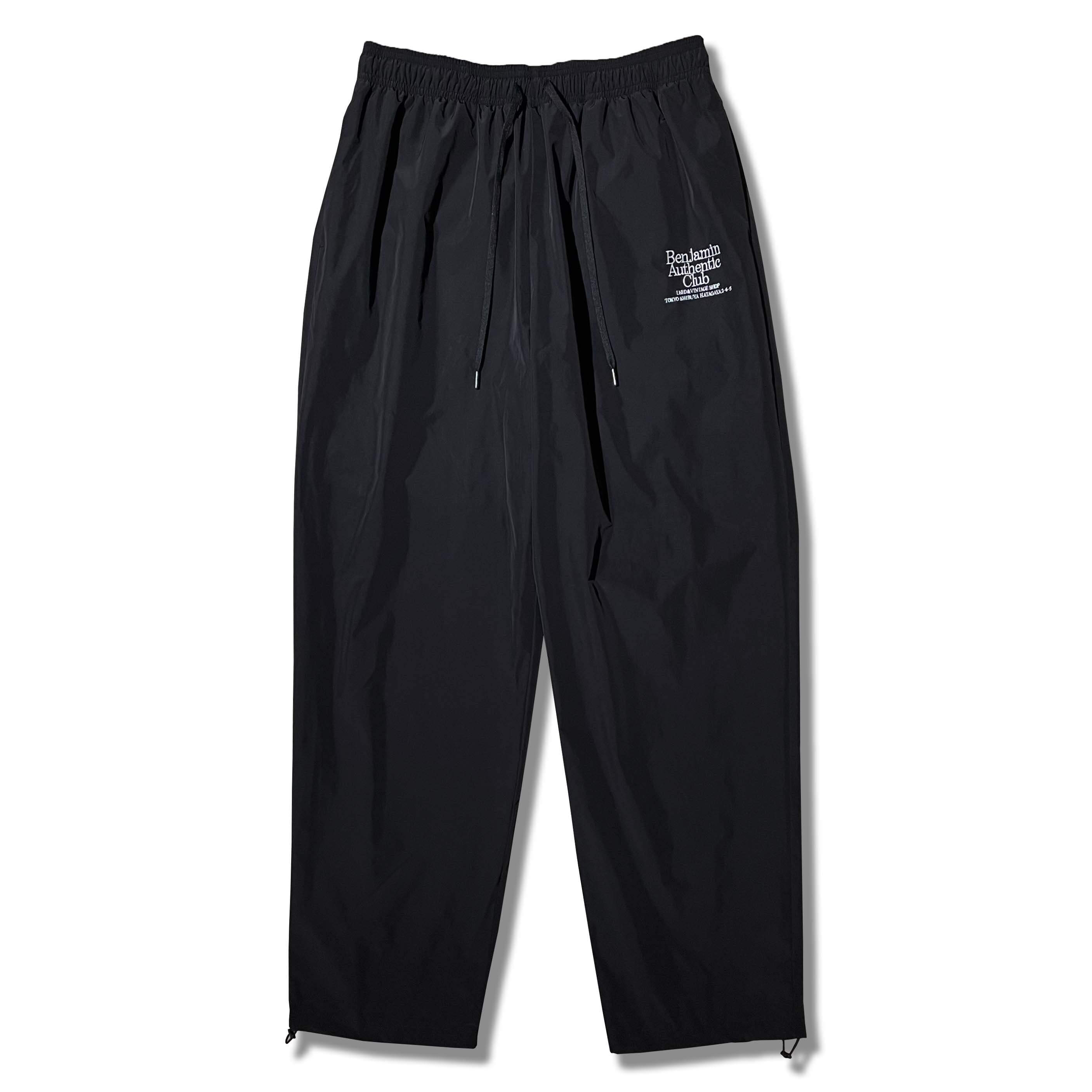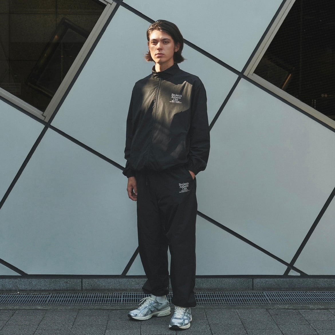 ハリがありながらもウエットな肌触りで高級感のあるナイロン生地を採用。撥水性のある機能素材で雨の日も着用しやすく汎用性の高いアイテム。程よくゆったりとしたサイズ感でありながら、綺麗にラインが出るシルエット。裾はゴムスピンドル仕様で絞りを効かせる事で自分好みのシルエットを作れ。ナイロン素材でよくある肌にまとわりつく事がないよう、メッシュの裏地を使用。カーキカラー配色でデザイン性を持たせている。左腿にブランドネームが刺繍されており大人っぽくもアイデンティティを感じる1着。セットアップではもちろん単体としても楽しめるディーテール、生地、こだわりの詰まったアイテムになっている。
