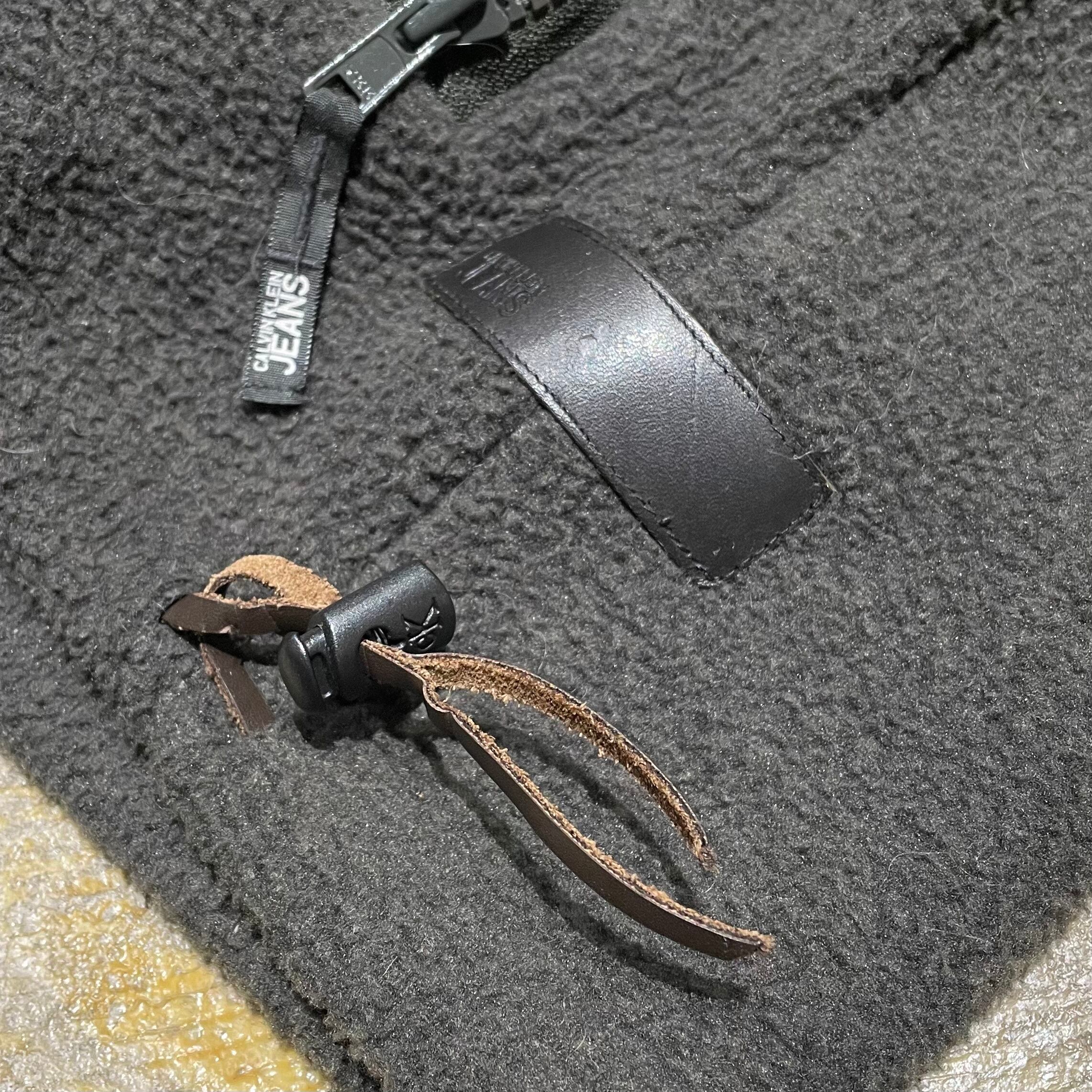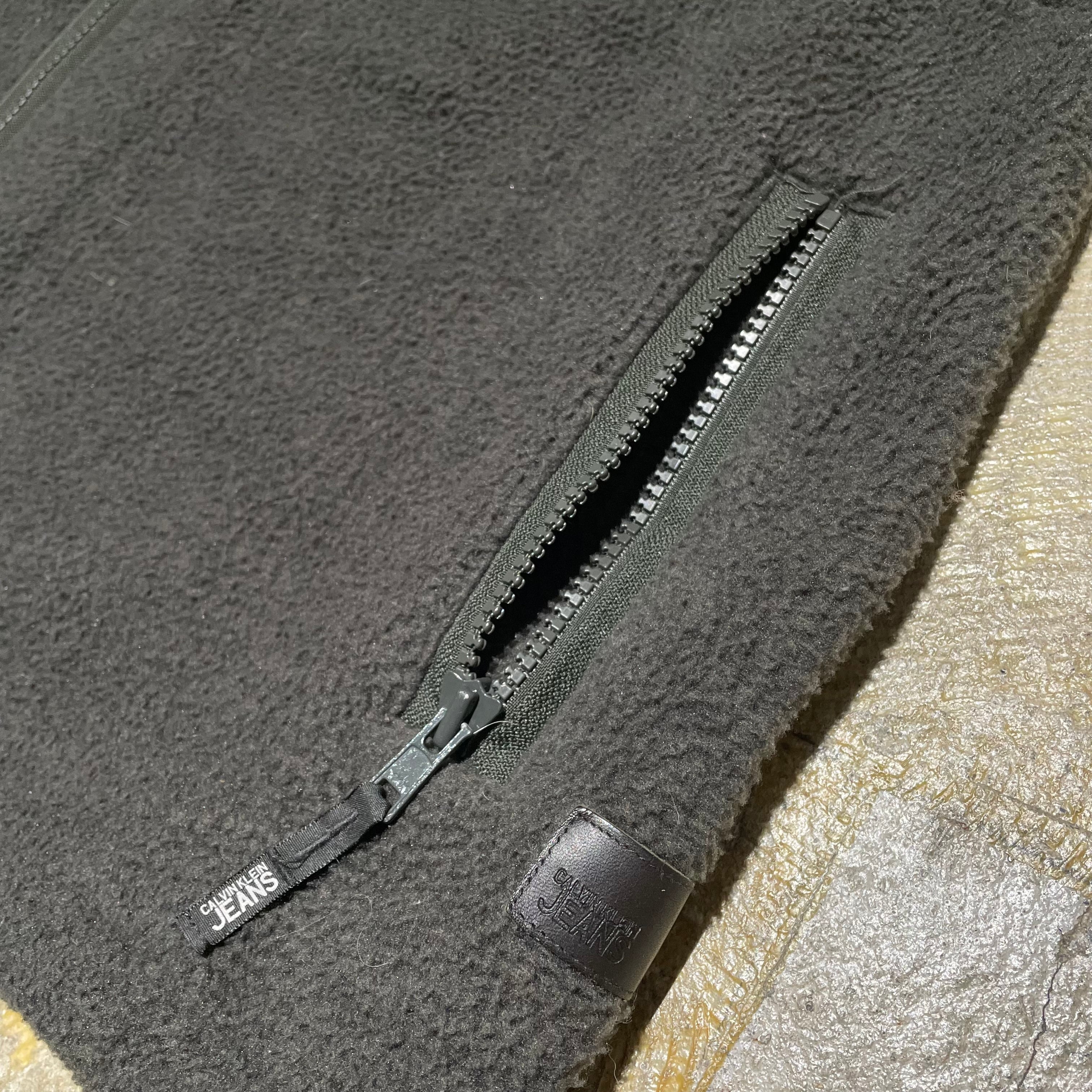 90年代のカルバンクラインジーンズのフリースベスト。ダブルの打ち合わせ仕様と裾のパッチとスピンドルにレザーを使ったデザイン製の高いアイテム。ニットの上からでも、アウターの上からでもコーディネートに加えるとことで、スタイルにアイデンティティを持たせることができるアイテム。