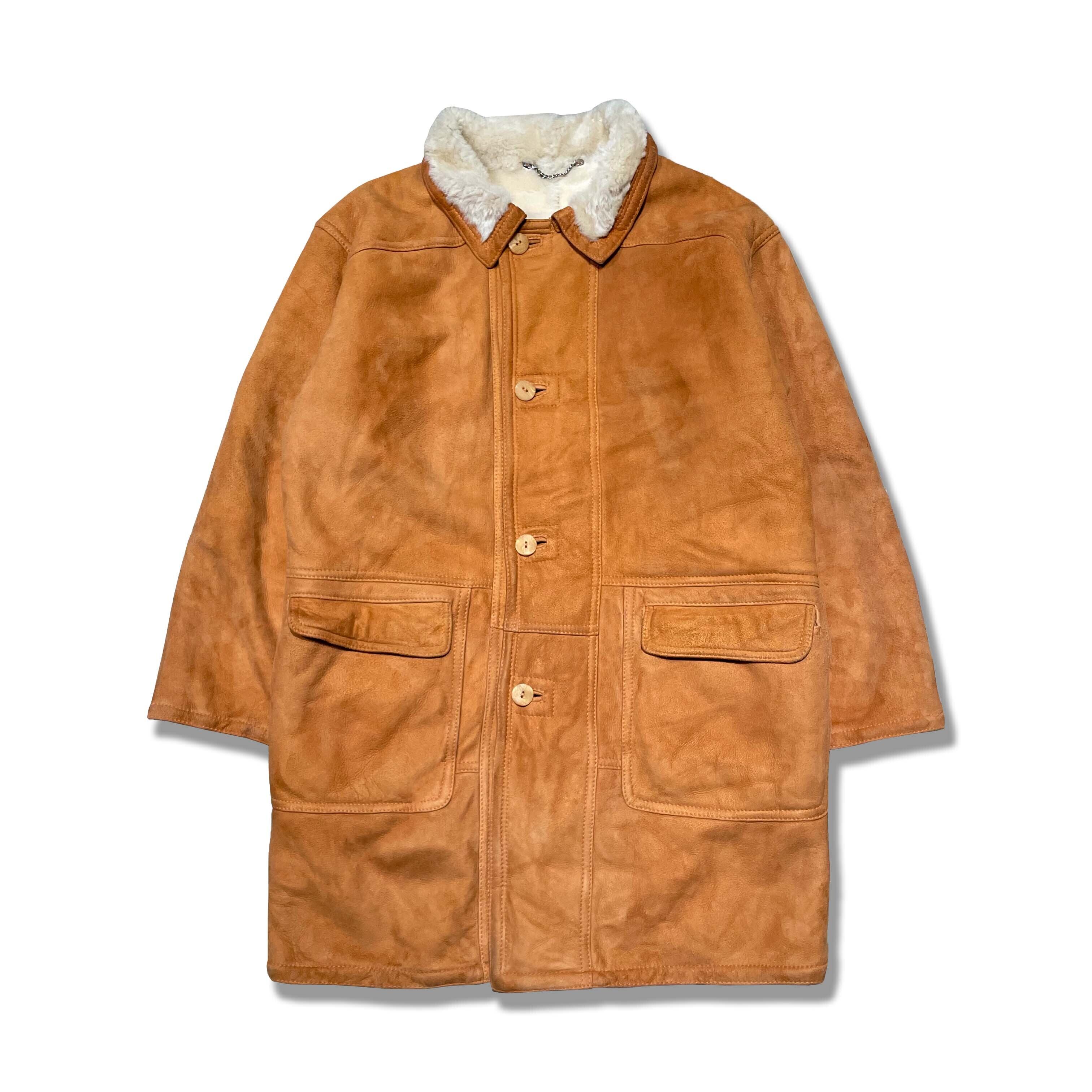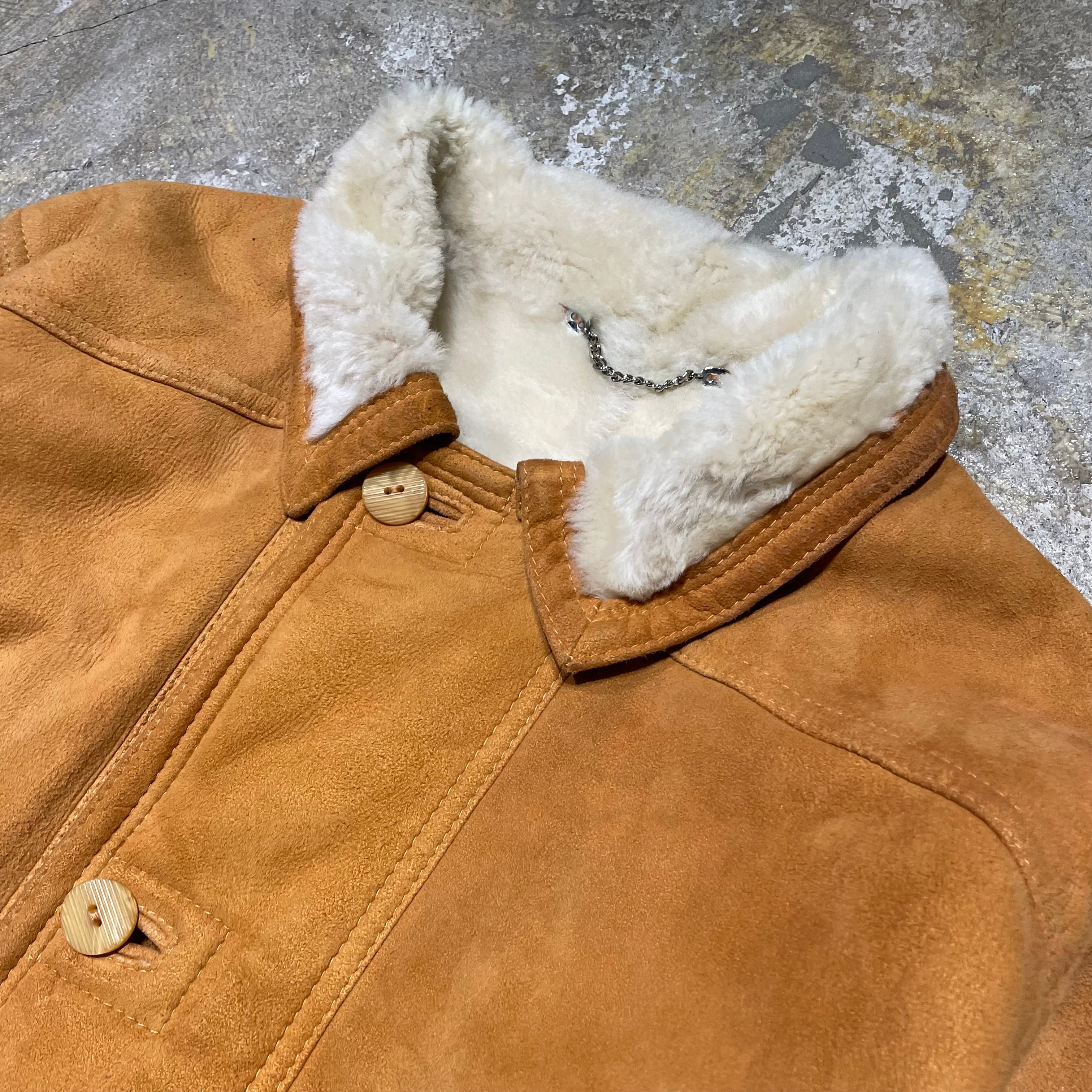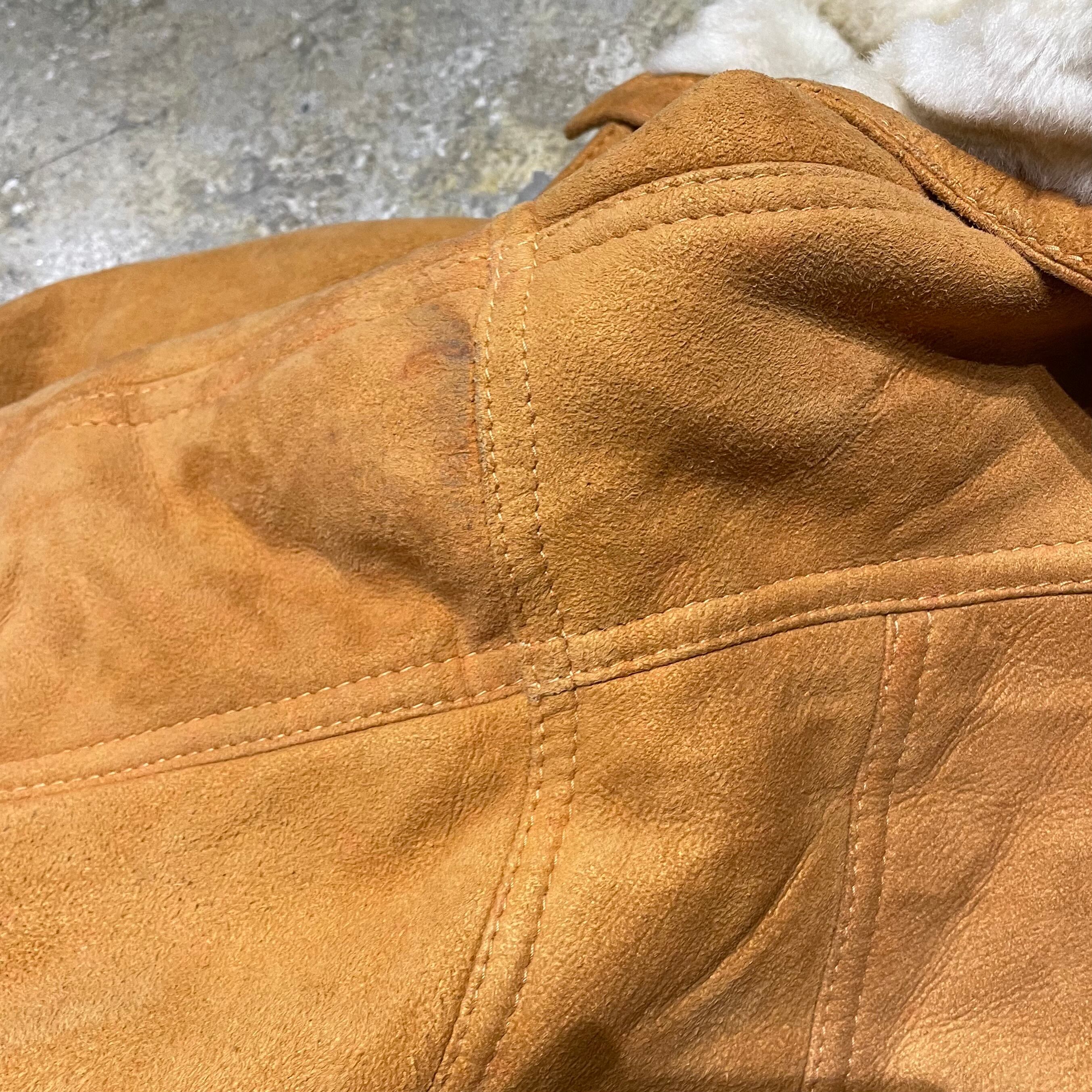 イタリア製のヌバックムートンレザーを使用したコート。しなやかで柔らかく、肌触りの良い高品質の1着。ヴィンテージで70〜80sのものになりますが裏面も綺麗な状態です。鮮やかなライトブラウンで重く見られがちなムートンですが、軽い印象を与えます。合わせやすいカラーリングで着やすいムートンコートになります。
